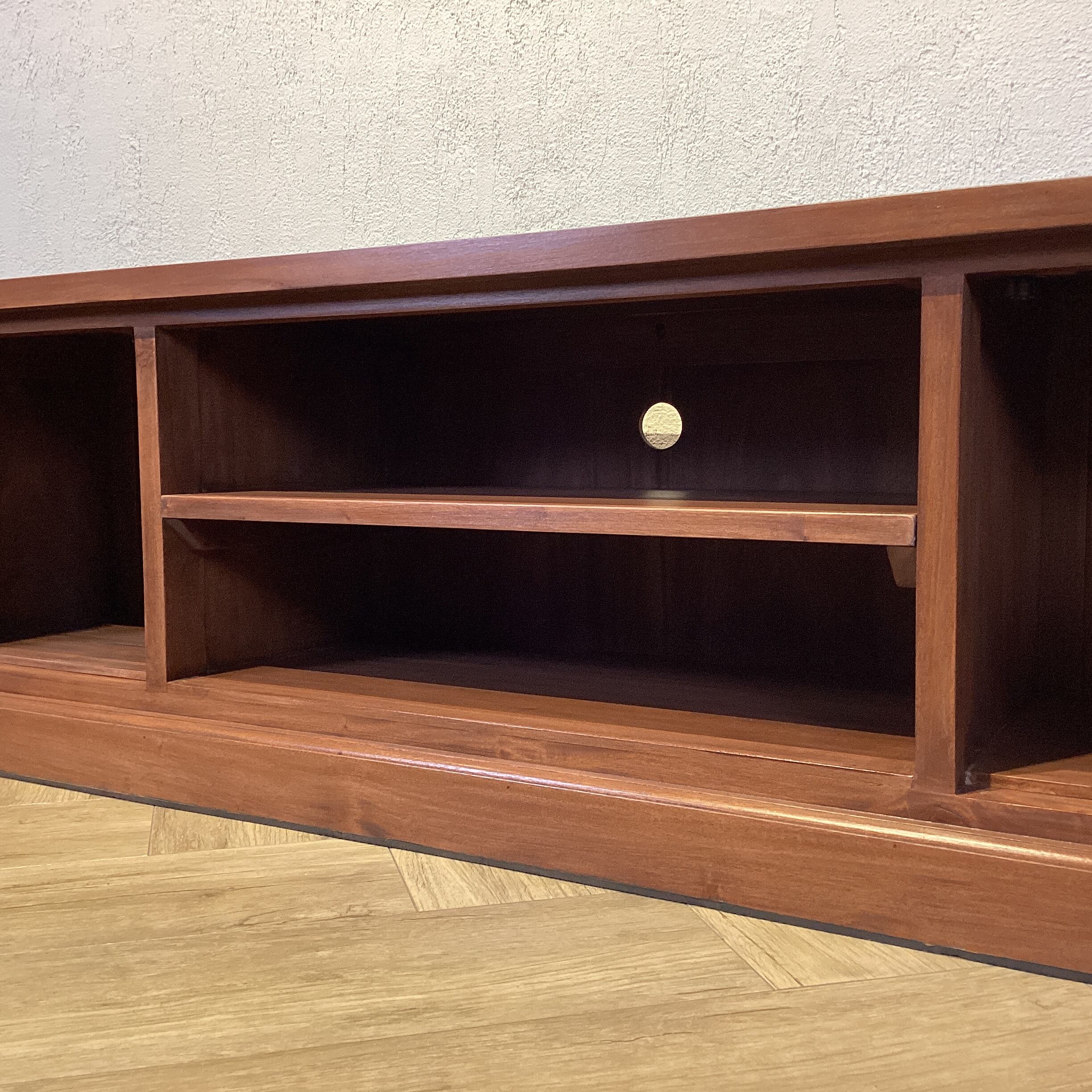 このTV台は、職人の手によってひとつひとつ丁寧に作られています。マホガニー材の質感を活かしつつ、すべての工程に心を込めて製作されています。機能性とデザイン性を兼ね備えた一品で、お部屋のインテリアに華を添えます。